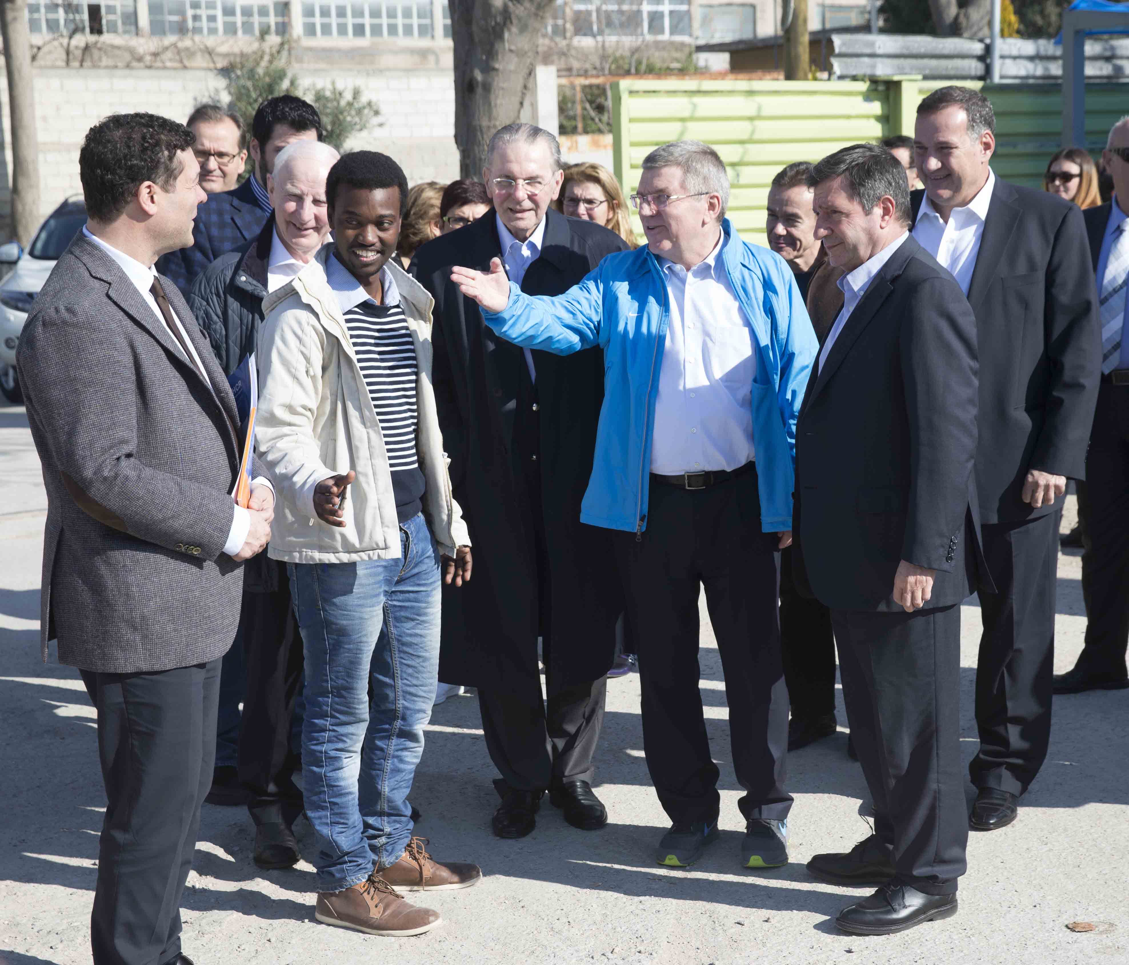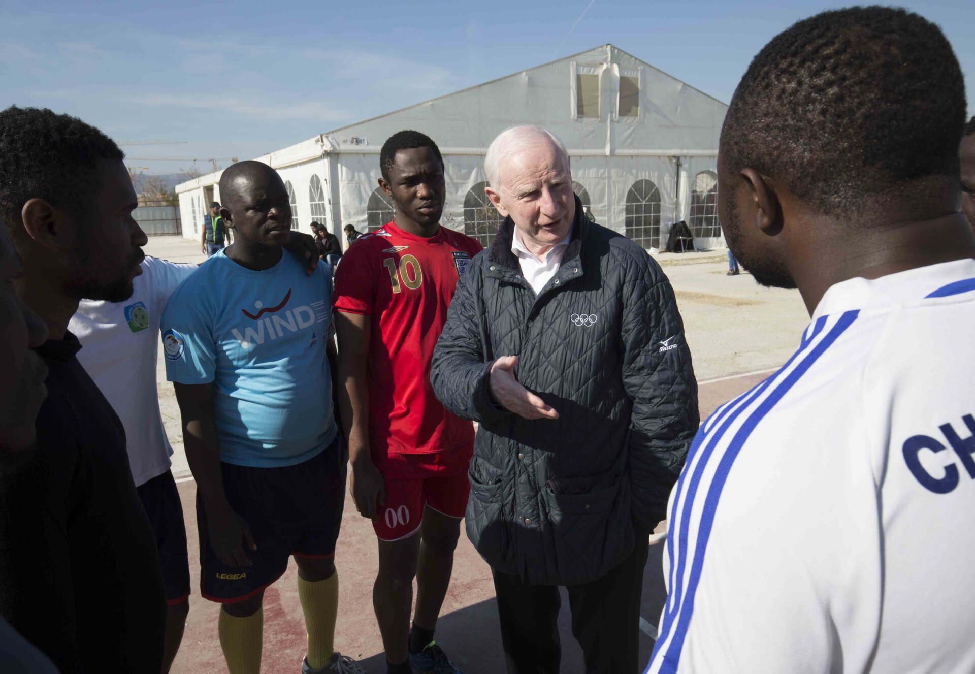 Athens Refugee camp As part of the official IOC visit Pat Hickey has a chat with the athletes at the Refugee Centre in Athens.