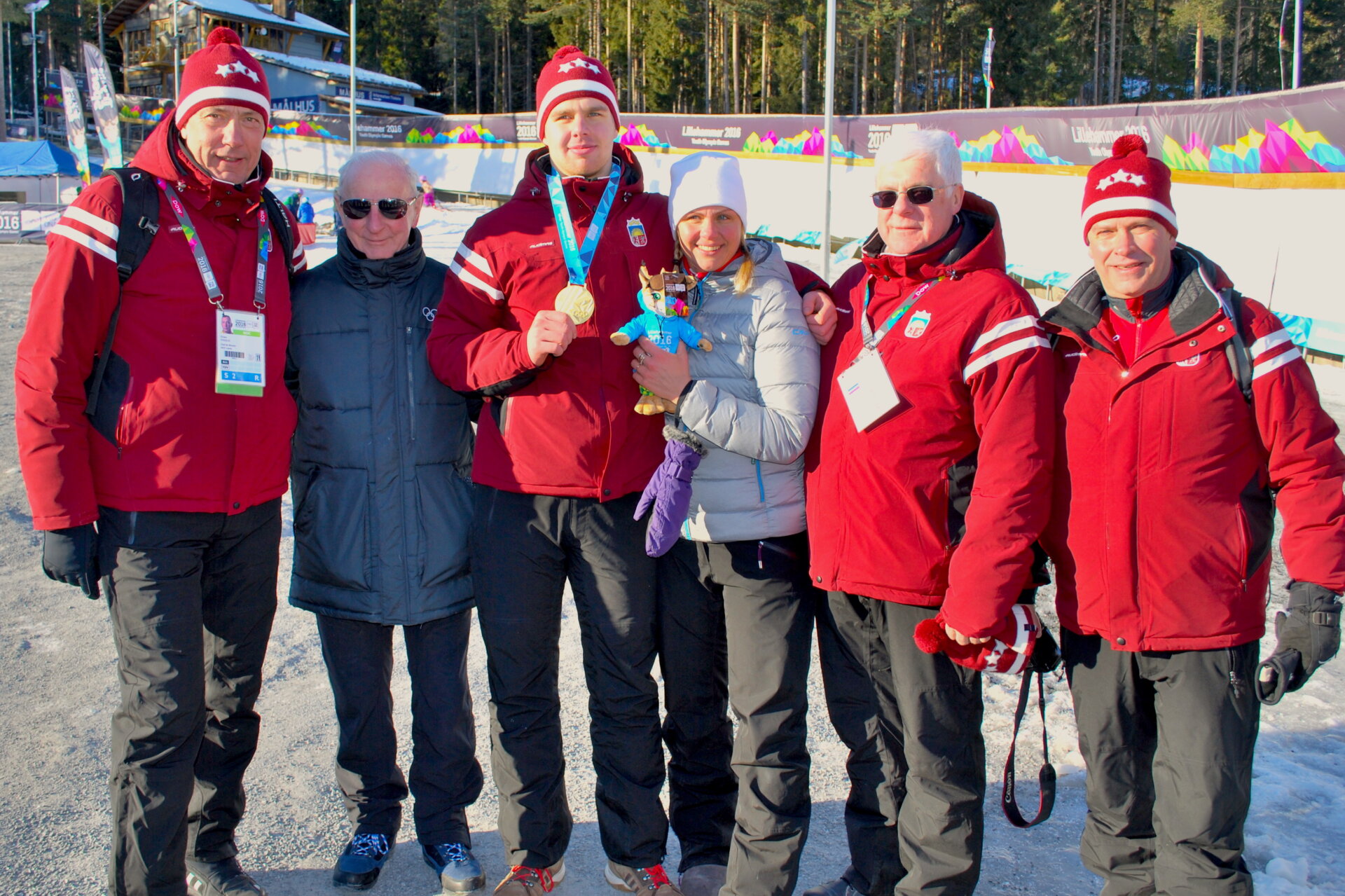 Einars Fogelis (Chief de Mission of team Latvia), Patrick Hickey, Kristers Aparjods (YOG champion in luge), Aiva Aparjode (mother, coach, Olympian), Aldons Vrublevskis (President of NOC Latvia), Atis Strenga (President of Latvian luge federation).