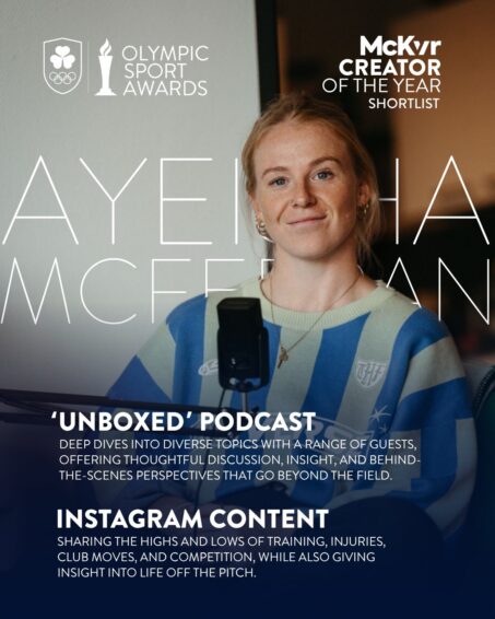Her podcast, ‘Unboxed’, deep dives into diverse topics with a range of guests, offering thoughtful discussion, insight, and behind-the-scenes perspectives that go beyond the field. Through this platform, Ayeisha has expanded the visibility of Irish hockey and Olympic sport more broadly, inspiring fans and athletes alike. By combining social media engagement with podcasting, she demonstrates innovation, authenticity, and measurable impact, making her a standout nominee for the Creator of the Year Award.