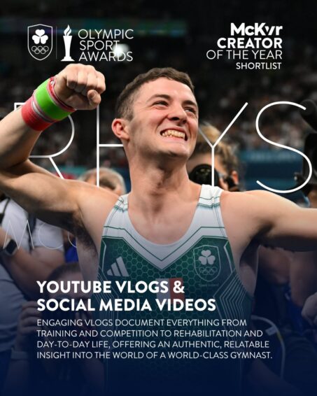Beyond storytelling, Rhys has leveraged his digital presence to collaborate with Gymnastics Ireland and his global partners, creatively merging sport, lifestyle, and community engagement. His content consistently drives awareness and connection, inspiring young athletes and engaging fans internationally, while raising the profile of Irish gymnastics.