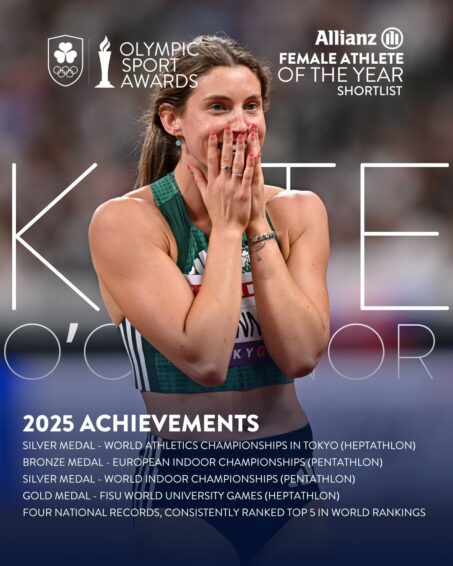 Kate O’Connor is nominated for Team Ireland Female Athlete of the Year following her historic achievement at the 2025 World Athletics Championships, where she won silver in the heptathlon.