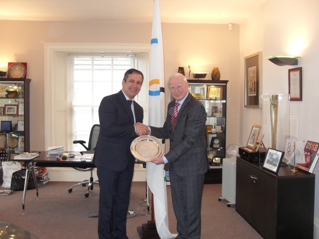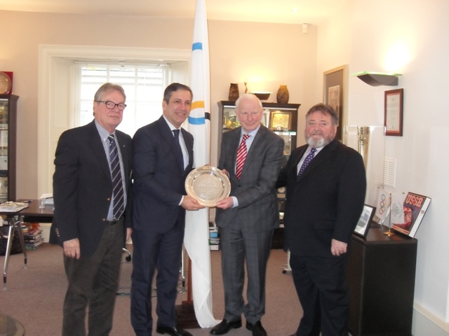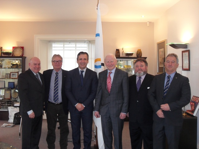 The Olympic Council of Ireland recently had a visit from the European Weightlifting Federation (EWF) at their headquarters in Dublin. In attendance were Dr Antonio Urso, President of EWF, Marino Ercolani Casadei, Treasurer EWF, Colin Buckley Executive Board Member EWF along with the President of Weightlifting Ireland John McDaid. Pat Hickey President OCI and Kevin Kilty Treasurer OCI greeted the Weightlifting delegates in Howth. Dr Urso presented Pat Hickey with a silver plaque for his contribution to Weightlifting.